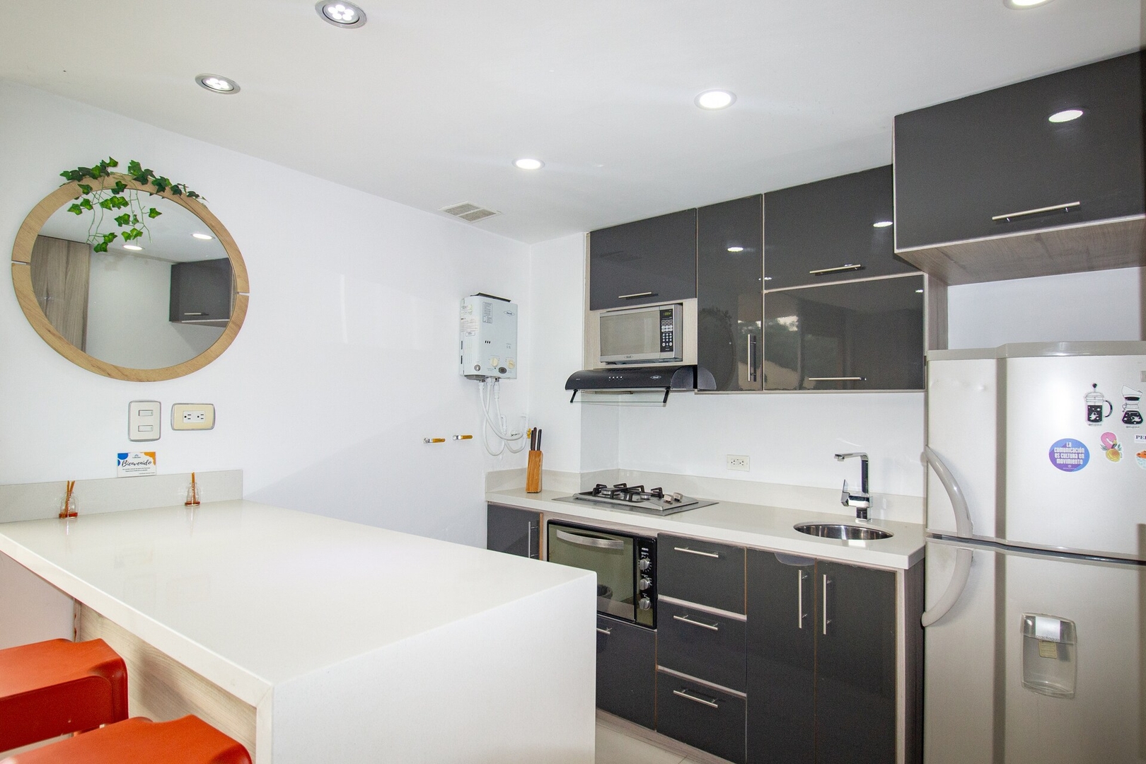 • Cocina totalmente abastecida y equipada: cafetera, nevera, sartenes, cubiertos, y mucho más. ¡Siéntete libre de cocinar!