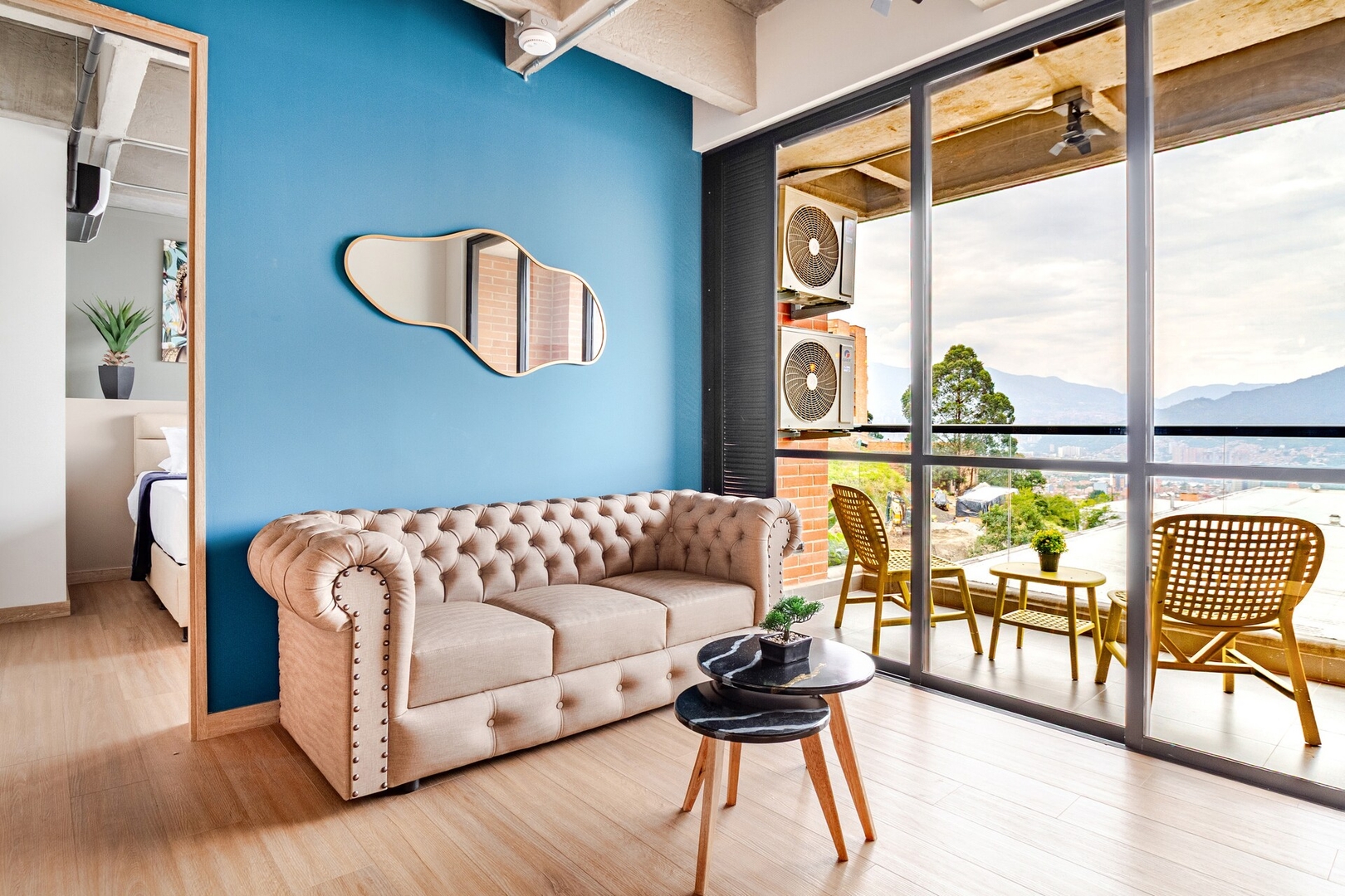 2 habitaciones cada una con baño privado y ventanal con cortinas oscuras , aire acondicionado
